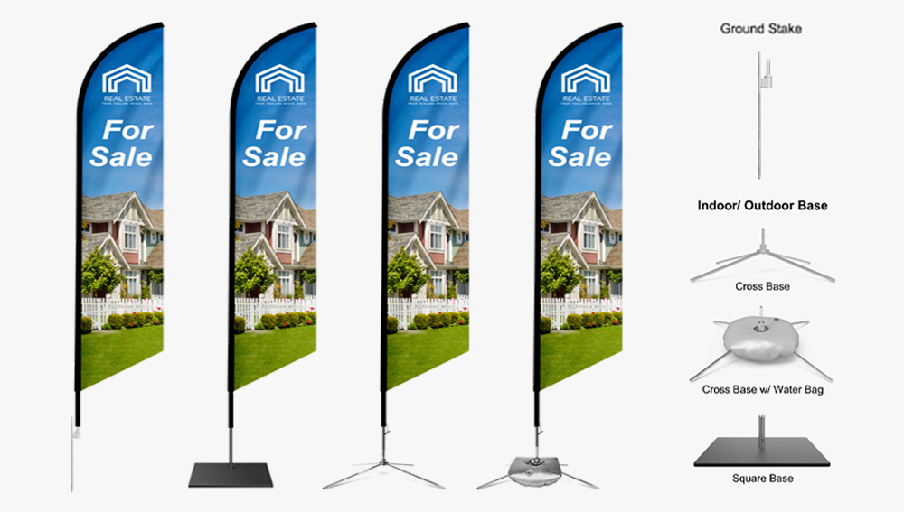 The standard ground stake can be used to install in soft ground, while the cross base or square base are heavy duty for hard surface staging. The optional carry bag is great for when you plan to travel with or store your flag.